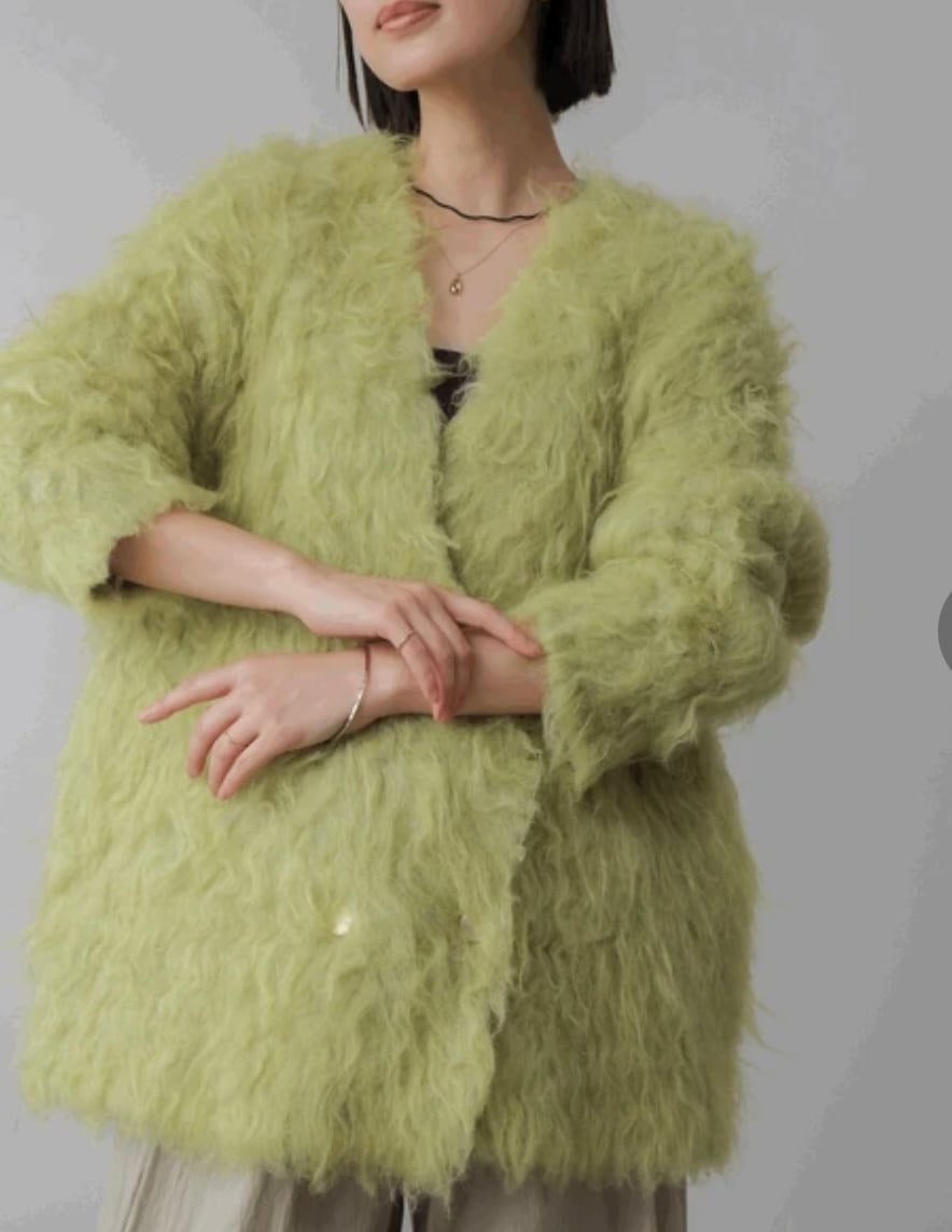ウェーブがかったロングシャギー素材感が価値感のあるニットジャケット。