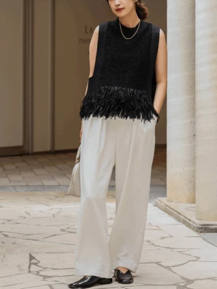 高めのウエスト位置で切り替えてフリンジデザインをしているので、スタイルUPしてみせてくれます。