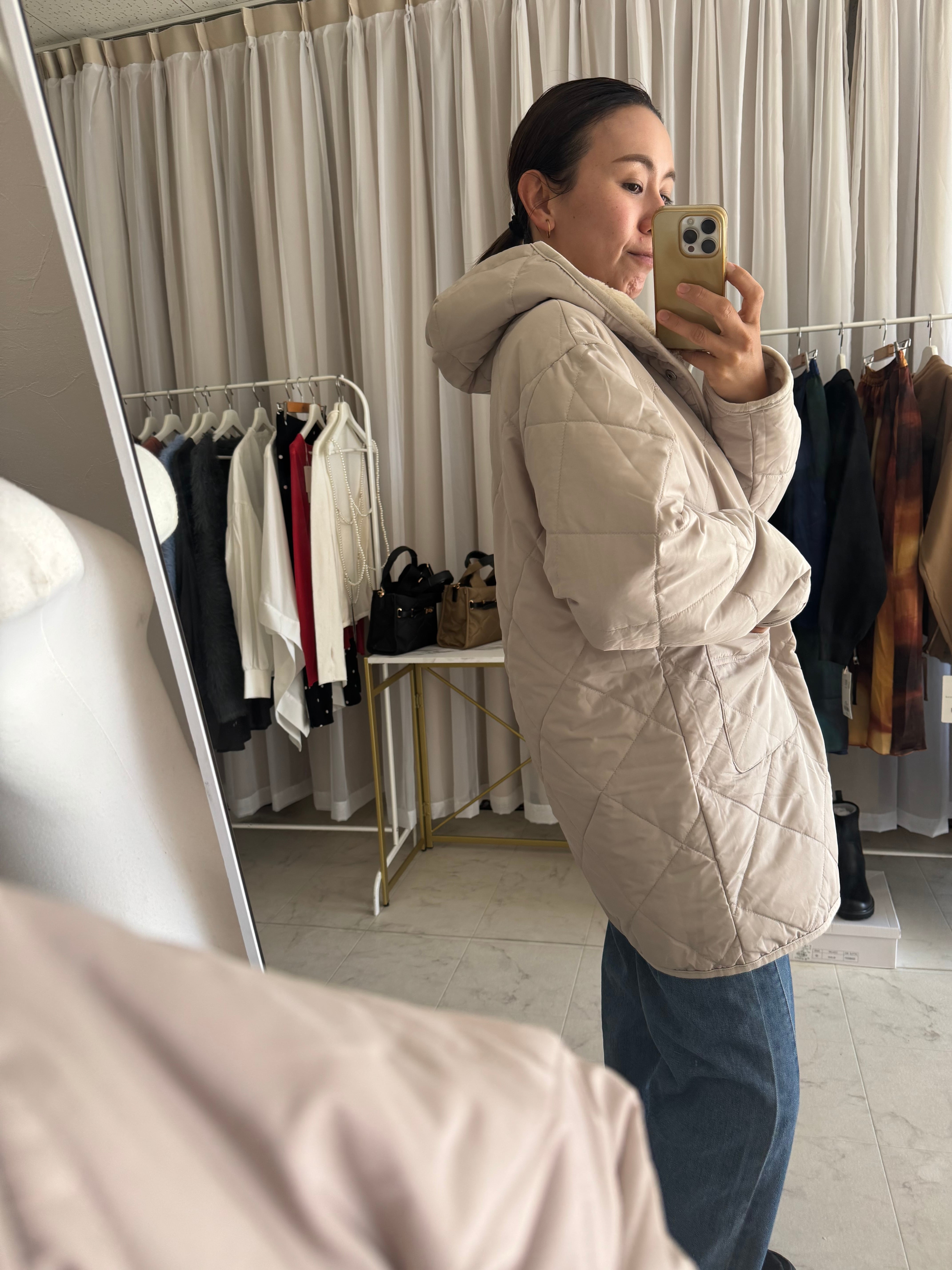 柔らかくてもこもことしたボア素材と、すべすべとした高級感あるファーがミックスされた表情豊かな表側は、見た目にもぬくもりを感じさせ、手に取った瞬間にやさしく包み込まれるような触感が広がります。裏返すとキルトステッチが効いたマットなタフタ面が現れ、適度なハリとツヤ感が洗練された印象をプラス。素材の違いによるシルエットの変化や、表情の切り替えが楽しめるリバーシブル仕様になっています。空気を含んだ中綿が軽さと保温性を両立させ、厚着せずとも暖かく過ごせる機能性も兼ね備えています。ボア面ではふわっとした質感がやわらかな印象を与え、タフタ面ではモード寄りの都会的な雰囲気に変化。両面とも、表情がありながらも派手すぎず、日常に自然と溶け込む色展開と素材感が絶妙です。