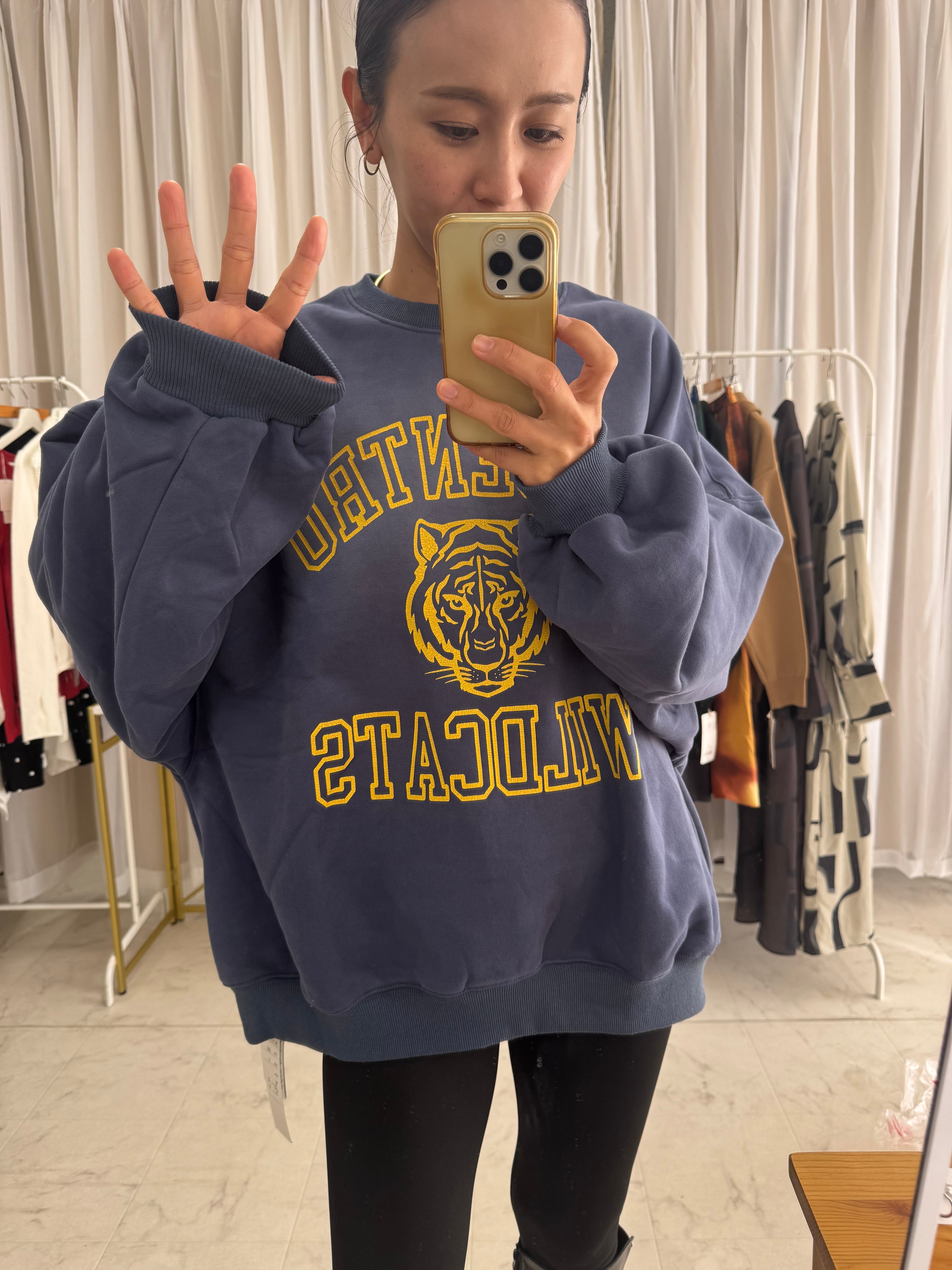 タイガーモチーフとロゴを大きくあしらうことで、背中や胸元がアイキャッチになる仕上がり。クラックプリントのひび割れ感が、まるで長く愛された一着のような深みを与え、着るほどに味わいが増す感覚を醸し出します。裾と袖口のリブは適度な締まり感を持たせて、ボディのゆとりをきれいに見せるアクセントにも。ドロップショルダーの設計により、肩の落ち感がラフな印象を生みつつも、袖中心に生まれるドレープが“甘さ”を加えるキー要素となっています。
