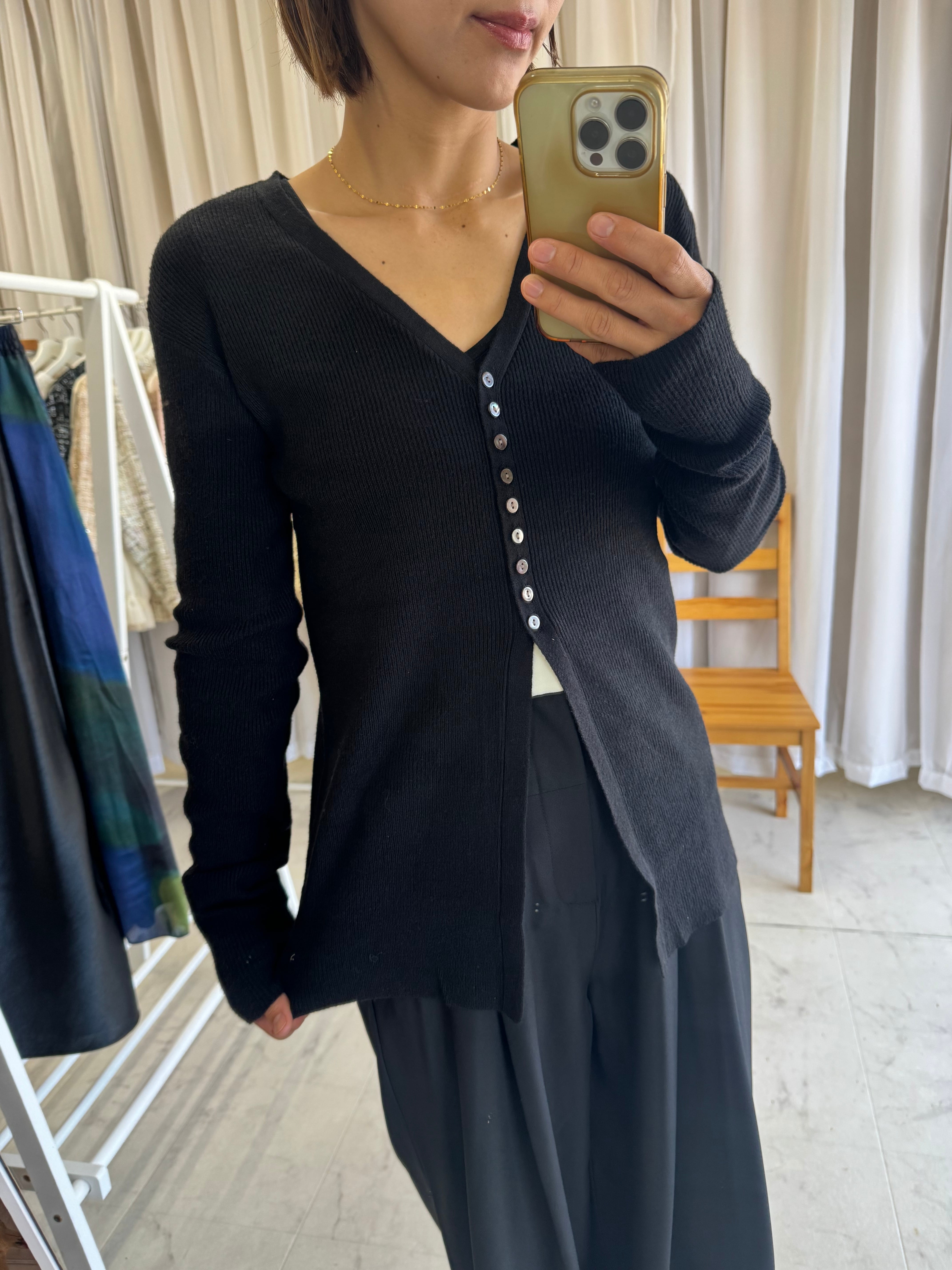 やわらかな肌あたりが魅力の、ソフトタッチ素材を使用したVネックカーディガン。