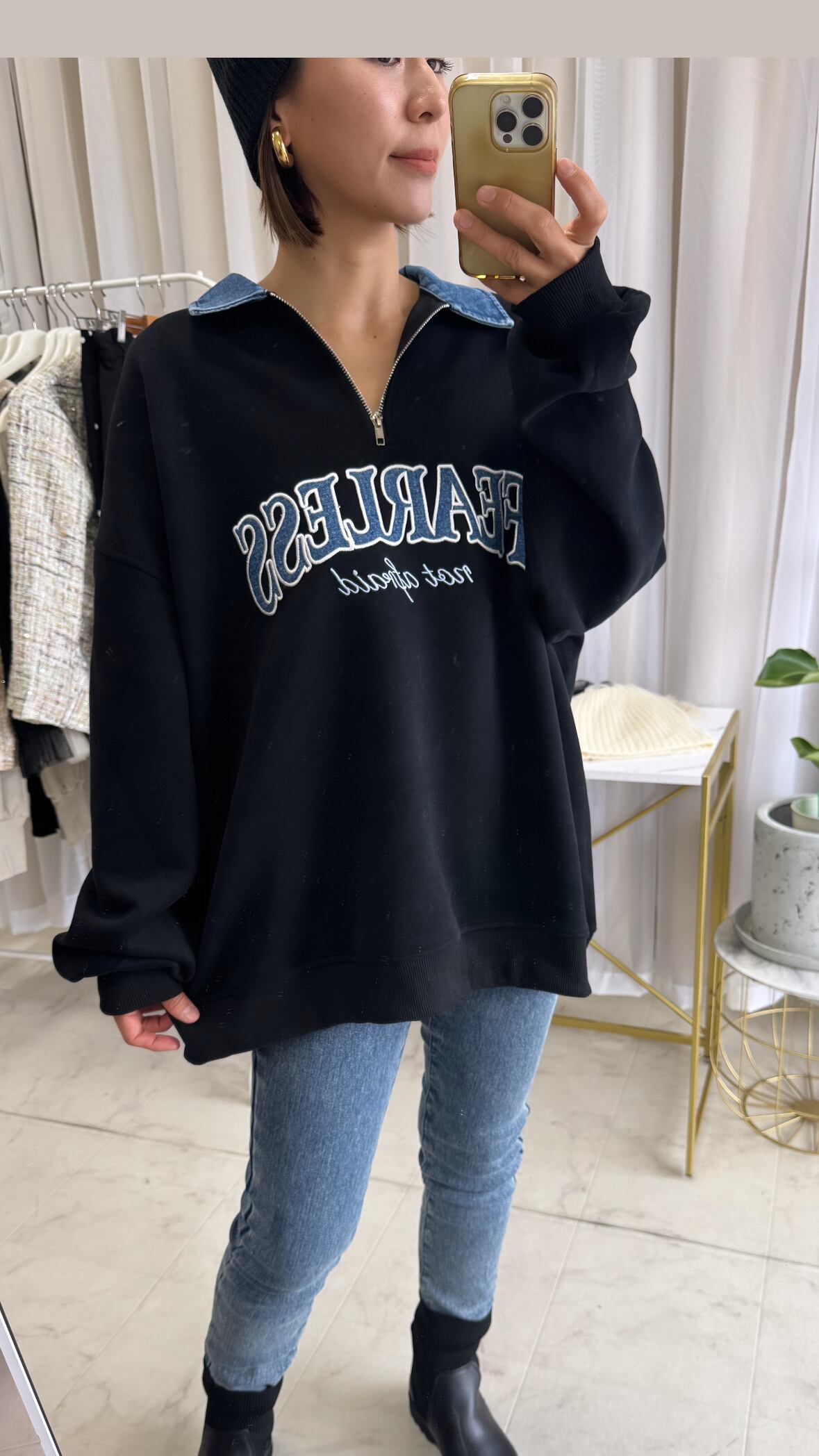 デニムロゴZIPチュニック デニム切替 襟デニム ハーフジップ スウェット