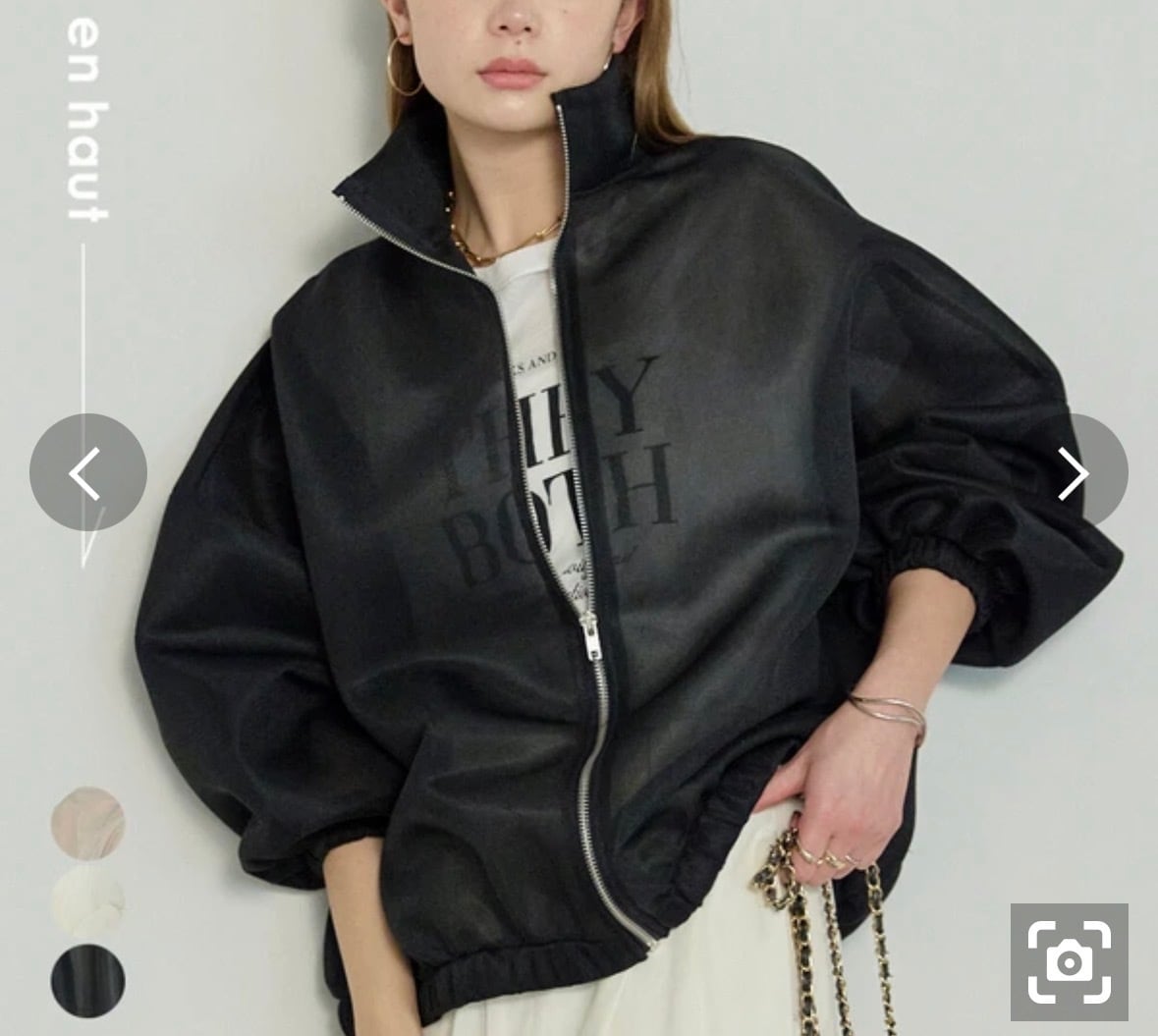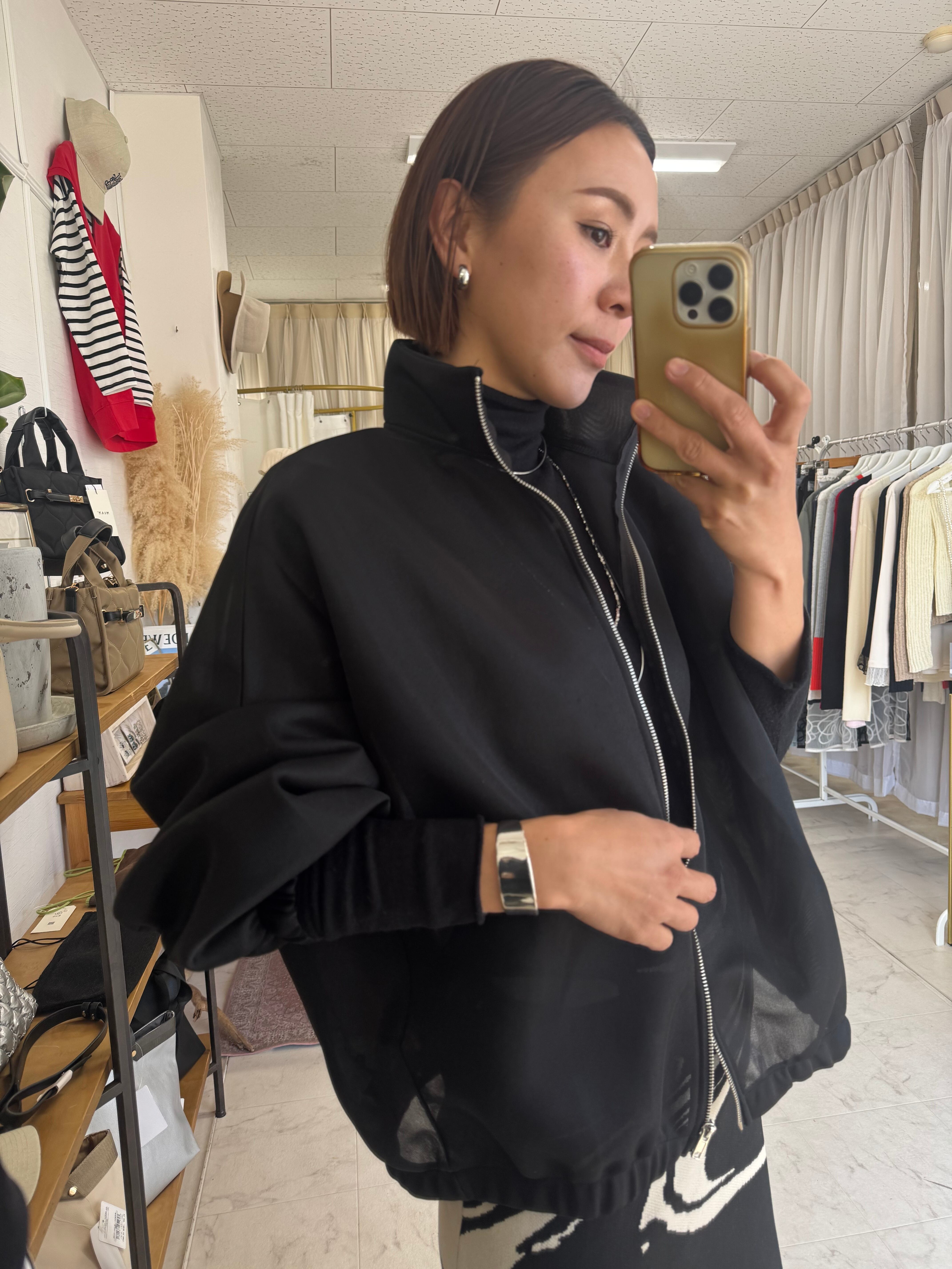 おすすめのスタイリングは、あえて質感の異なるナロースカートや、艶やかなサテンのワイドパンツを合わせた「異素材ミックス」のきれいめスタイル。インナーにはコンパクトなキャミソールやタンクトップを選び、ヘルシーな肌見せを楽しむのが今季らしい着こなしです。よりカジュアルに振るなら、ハイウエストのデニムやジョガーパンツを合わせ、足元には華奢なヒールを投入して、スポーティーさと女性らしさのコントラストを強調して。ジップを半分ほど開け、襟を後ろに抜いて羽織ることで、奥行きのある立体的なシルエットが際立ち、洗練された大人のカジュアルスタイルへと導きます。