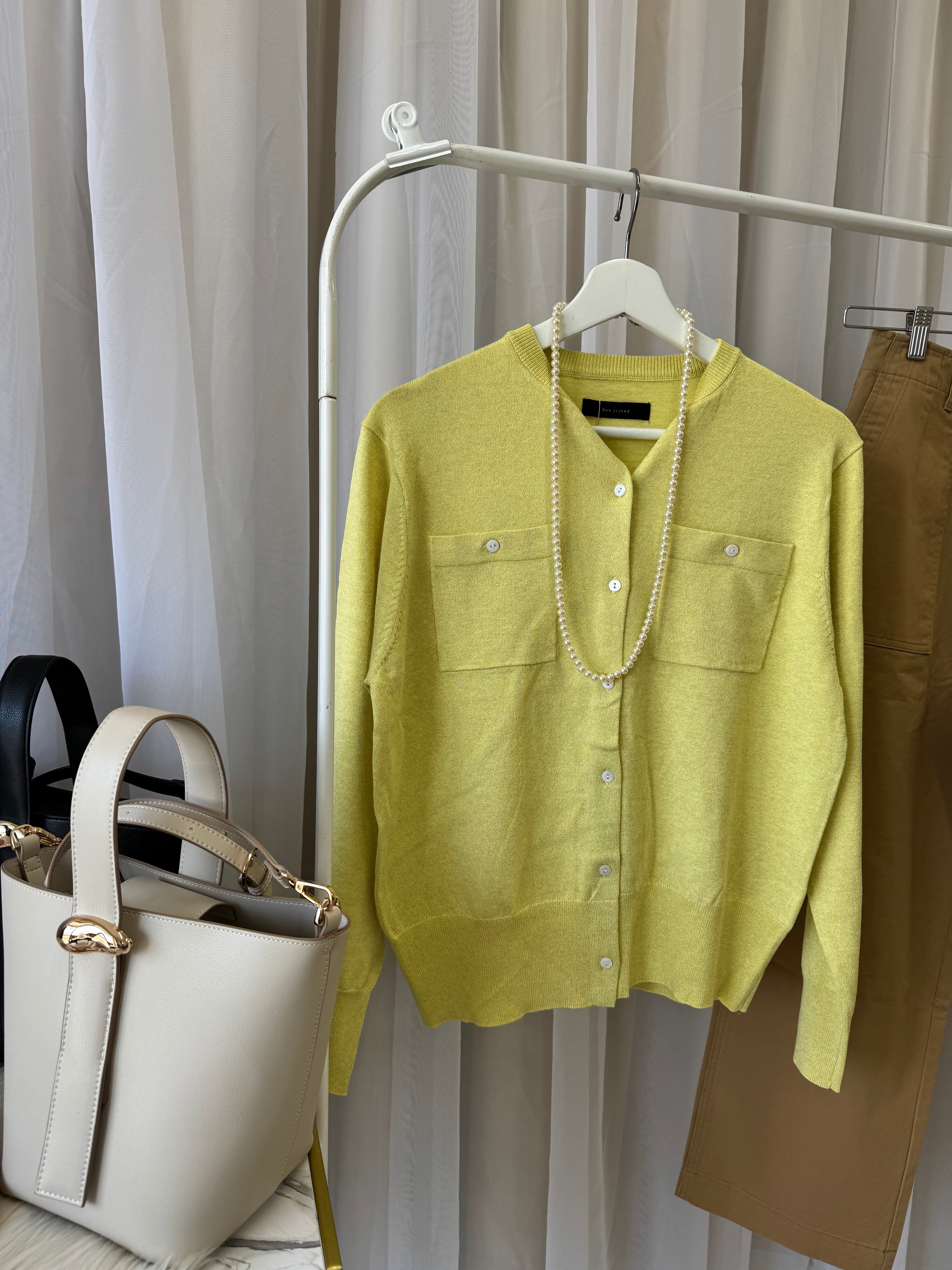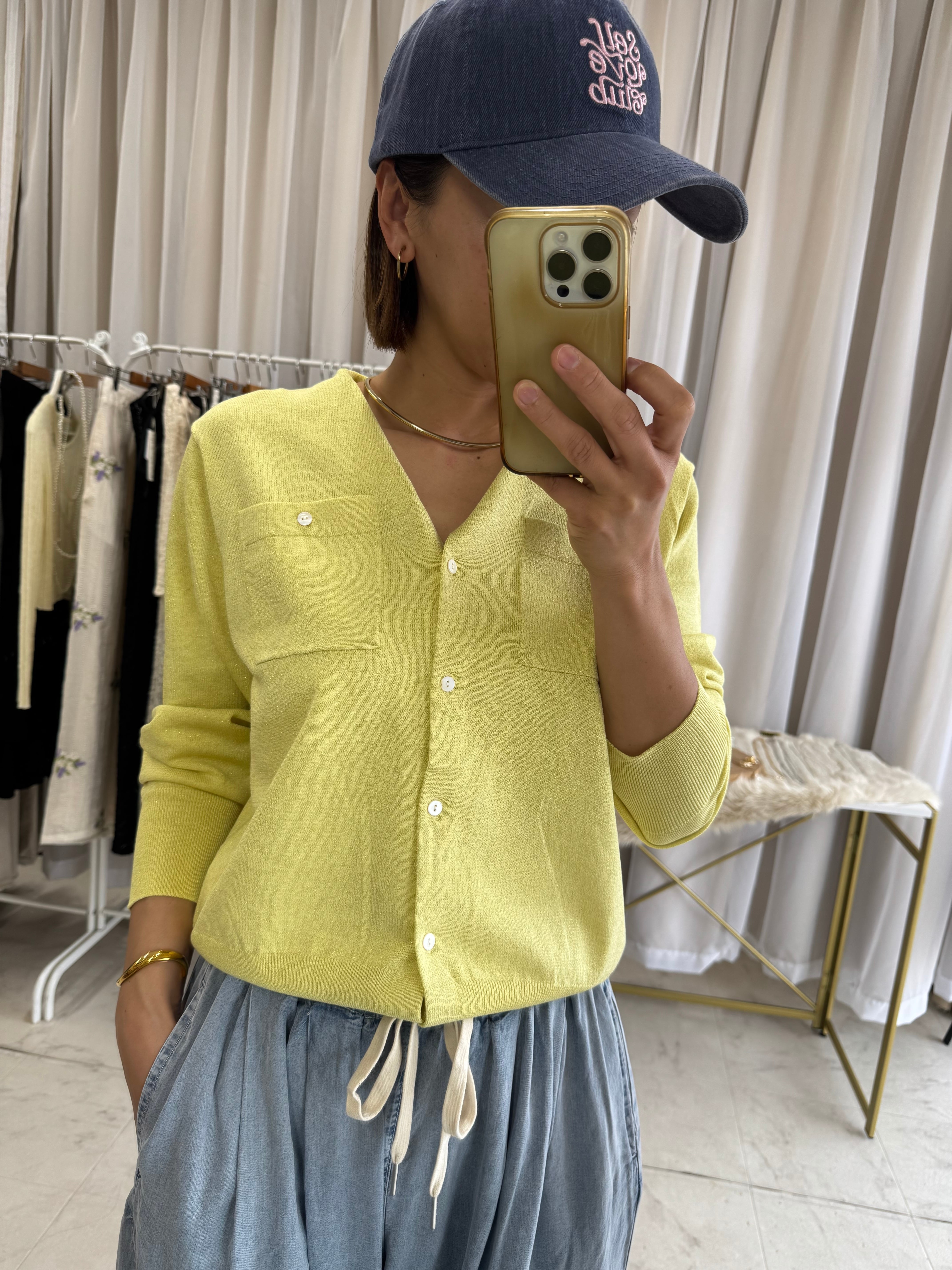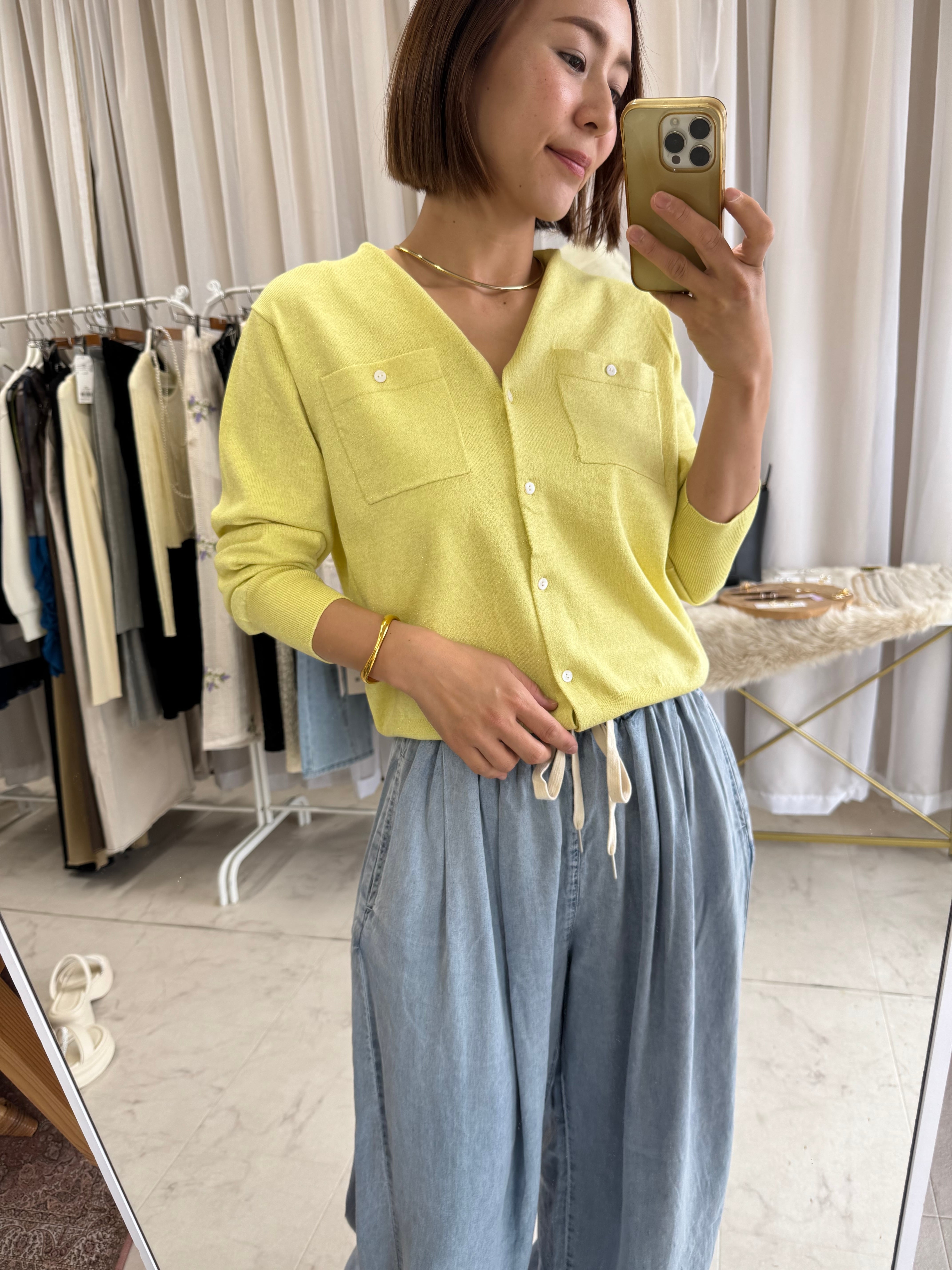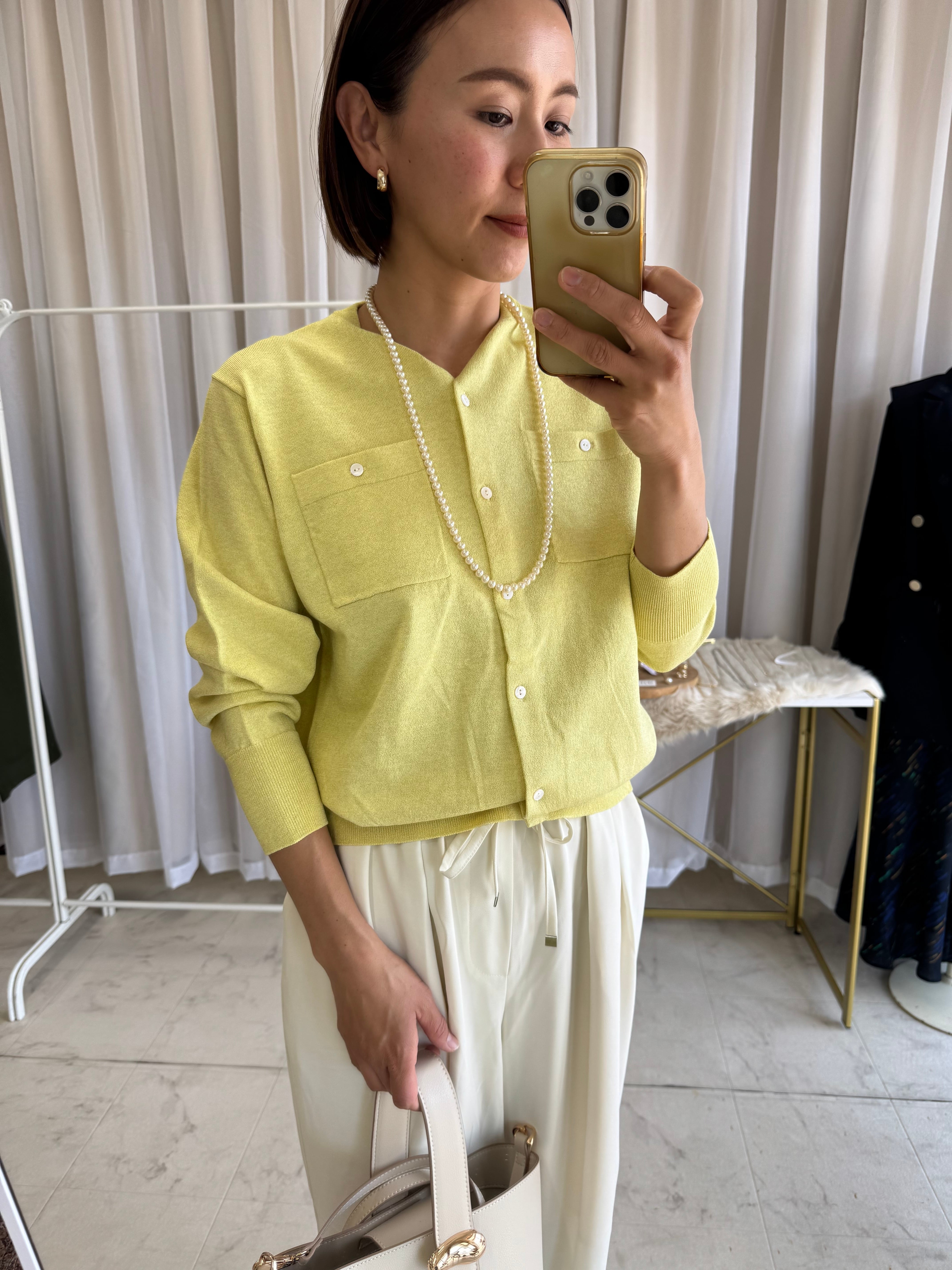 さりげなくきらめくマイクロラメが、大人のスタイリングに程よい華やかさを添える丸首ニットカーディガン。