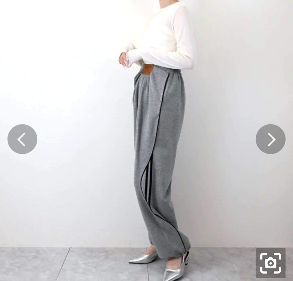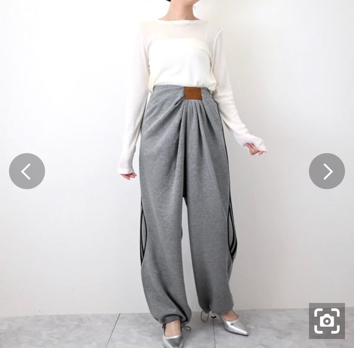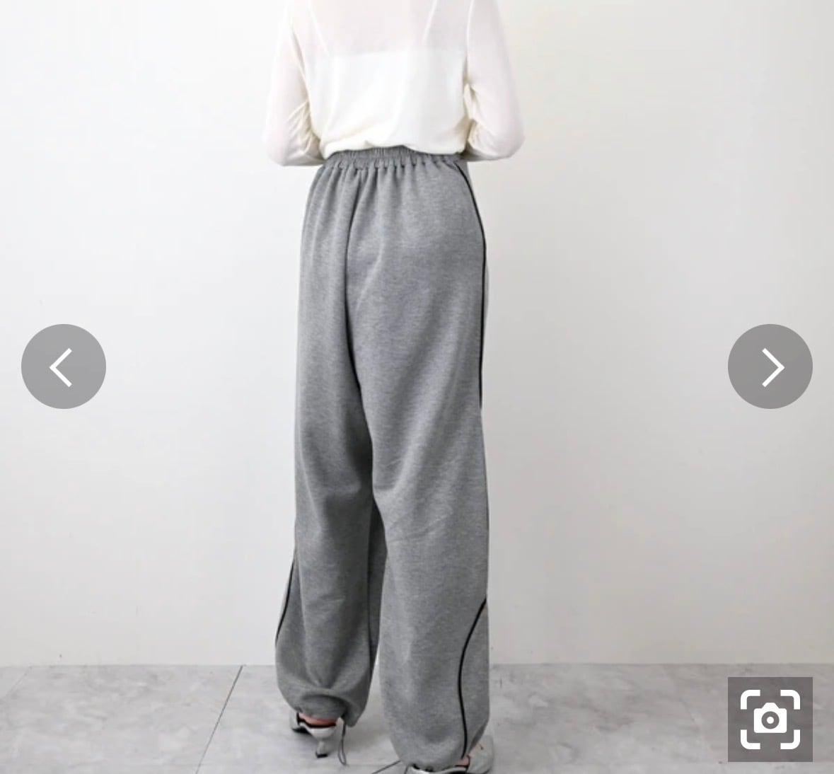 ボトム丈:106cm、ウエスト:66cm(ゴム:92cm)、ヒップ:107+cm、前ワタリ:37cm(右)、後ワタリ:39.5cm、前股上:45cm、後股上:48cm、裾周り:56cm、股下:61cm